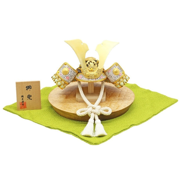 Là tác phẩm của nghệ nhân Sakutaro, mũ giáp có kích cỡ nhỏ gọn và được thiết kế tinh tế với đường viền mũ được bện tỉ mỉ từ các lọn chỉ màu xanh lá nhạt tươi sáng, dịu mắt.